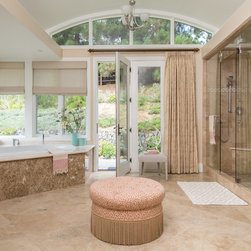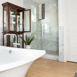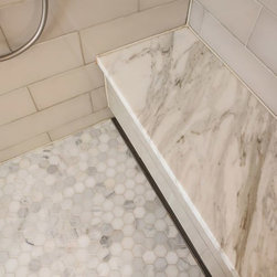 Light and airy bathroom with marble tile.