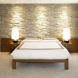 Contemporary bedroom with organic elements. Stone tile accent wall.