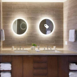 Spa-like sink area with round mirrors and great lighting.