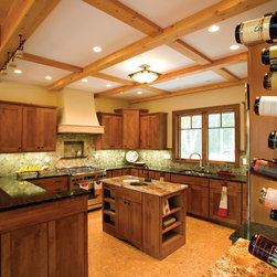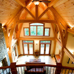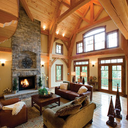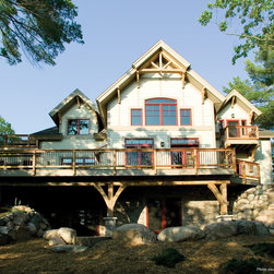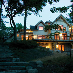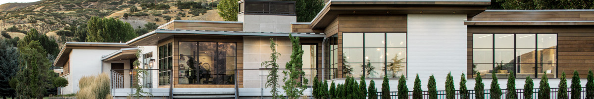 At night, unique configurations of Ultra Series windows and doors illuminate Timberhaven's exterior. The inswing patio doors are stacked with transom windows that have a custom performance divided lite (PDL) pattern. Ultra Series crank-out and picture casement windows are stacked with segment head...