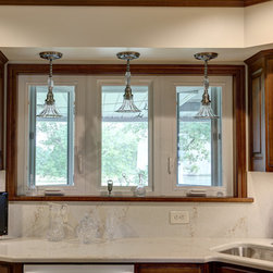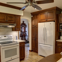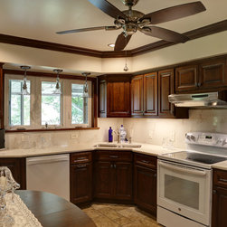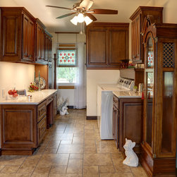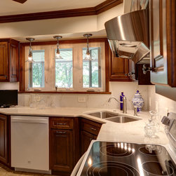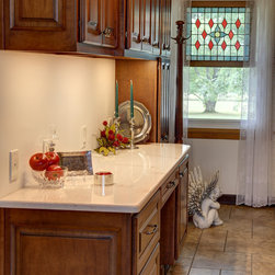 Traditional and rich cherry kitchen with quartz counters and backsplash create a timeless, elegant feel that is hard not to appreciate! The door to the kitchen was strategically moved 2 feet to improve the flow and storage-100% improvement! The entryway was also designed to match with a classy laundry and organized desk and sewing space.