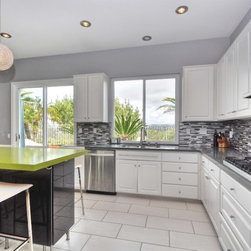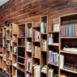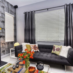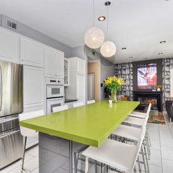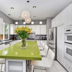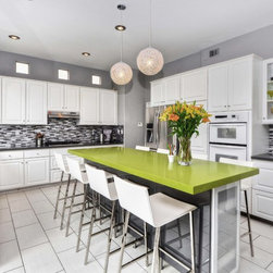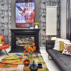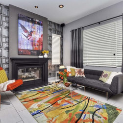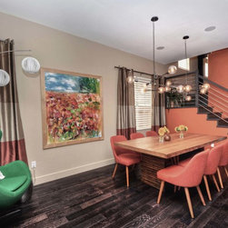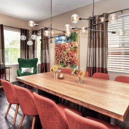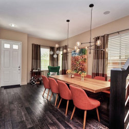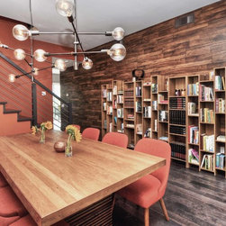 This space was designed for a European couple living in Southern California who had an appreciation for creativity in design. The space needed a design approach that was bold and vibrant while maintaining a modern, sophisticated feel. The formal living room was transformed into a modern rustic dining space that doubles as a library. The large dining table can seat up to ten people and is perfect for dinner parties. Another entertainment space is the oversized kitchen counter that can seat up to ten more guests. The clients love to host parties in a laid back but inspiring atmosphere. The family room is anchored by a black fireplace and a fun accent wall that generates an engaging visual. The furniture pieces and light fixtures are clean lined, mid-century modern inspired, and combined with rustic modern items made out of reclaimed wood. The vibrant colors add a sense of playfulness to the overall atmosphere.