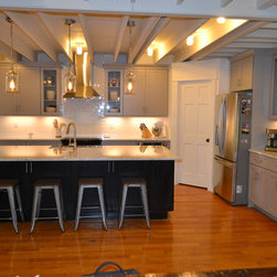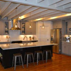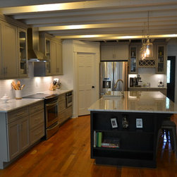 Spectacular kitchen with Grey perimeter and black on oak Island! Exposed ceiling beams and wood flooring reclaimed from a tobacco warehouse make this a truly unique kitchen.