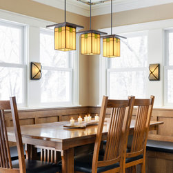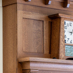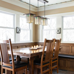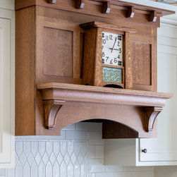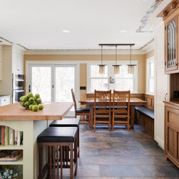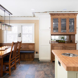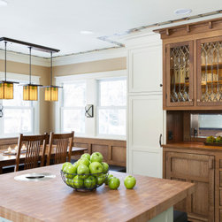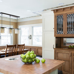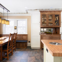 Our homeowners wanted to be involved in the project, so the husband hand crafted the banquette bench, the center section of the buffet and the clock you see on the wood hood in his personal wood