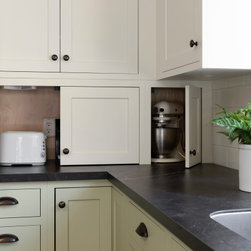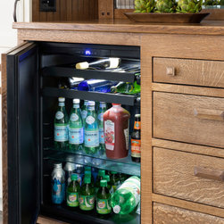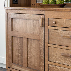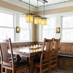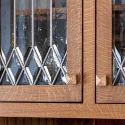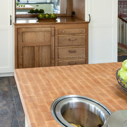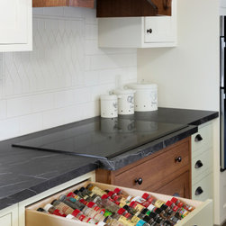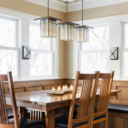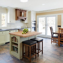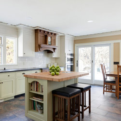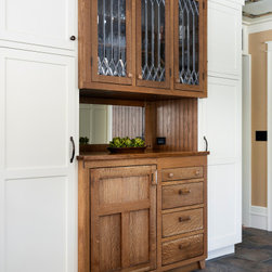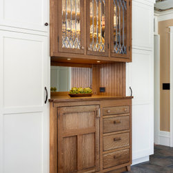 Being environmentally conscious was a priority, so this room is heated by in-floor radiant heating that was tied into the existing homes energy efficient geothermal system. We built in a removable compost bin into the island top and designed the buffet around 3 salvaged stained-glass panels. The addition of 5 new energy efficient windows and the solar tube over the island provide ample light during the day without needed to turn on any fixtures.