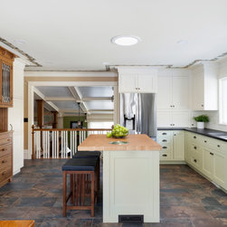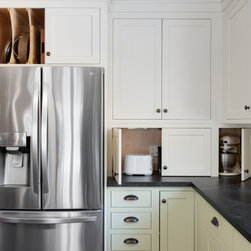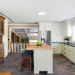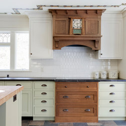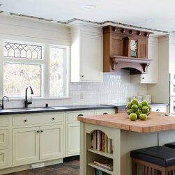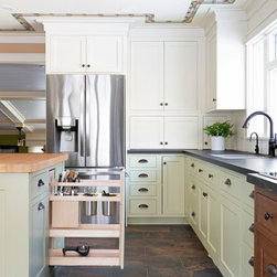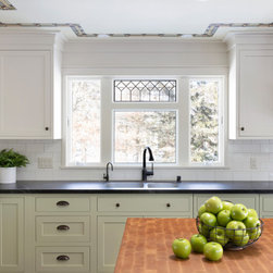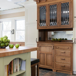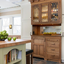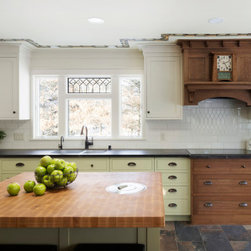 This was a fun project to work on because the homeowners wanted something a little different. We incorporated 3 different cabinet colors and 3 different countertop materials. The upper cabinets and pantries are cream, the base cabinets are a lovely green, and the accent cabinets are quarter sawn white oak in a medium stain. The perimeter countertops are a hard waring soap stone looking porcelain. The island top is end grain maple butcher block that you can cut on and the buffet countertop is stained quarter sawn oak to match the hutch. In a world of white-on-white kitchens, this was a nice change of pace.