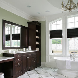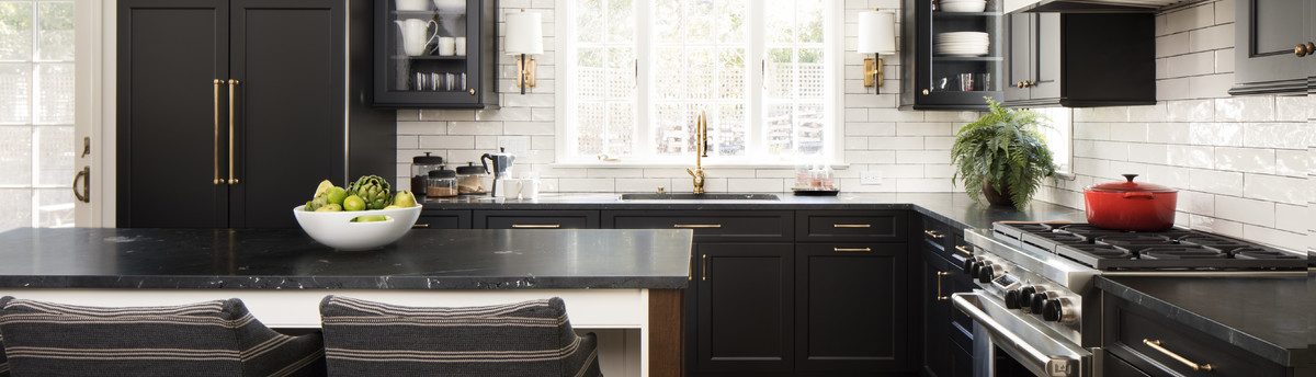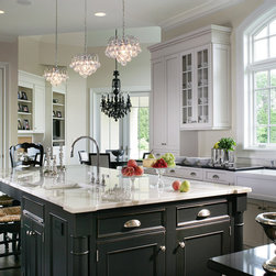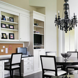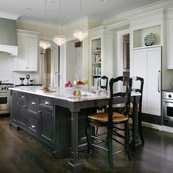 Wood-mode/Brookhaven Kitchen with overlay white cabinets with a glaze on the perimeter with inset distressed black cabinets on the island. Kitchen features include custom wood and stainless steel hood, two ovens, mullion glass doors on wall cabinets and built-in desk with TV unit.