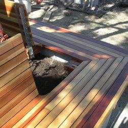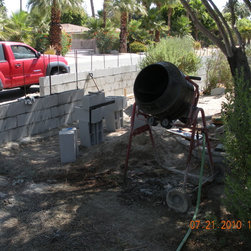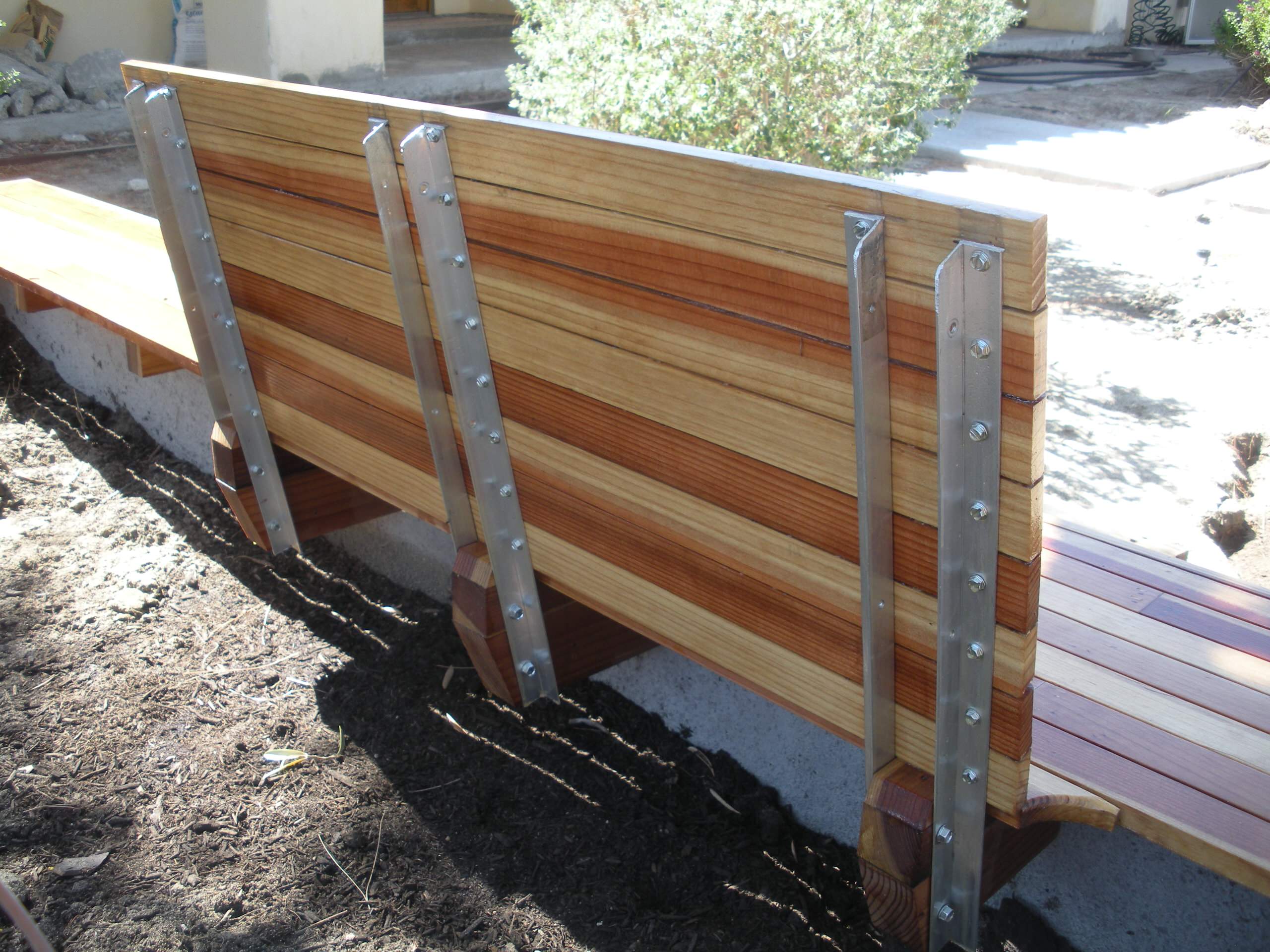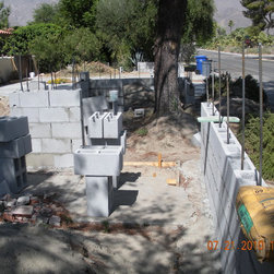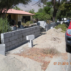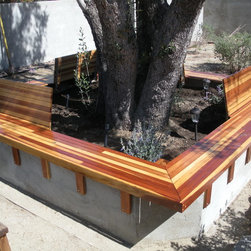 Creating a private outdoor space; First we enclosed the front yard with the wall system, then we replaced the broken bricks that surrounded the Olive tree, with a new code-built, concrete knee wall and Redwood bench surround. Grass and irrigation taken care of at the same time. Approx. 100 ft2...