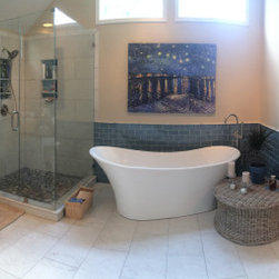 Tore out dated garden tub and prefab shower re-routed plumbing for standalone tub and enlarged shower space new tile throughout cabinets refinished with new countertops