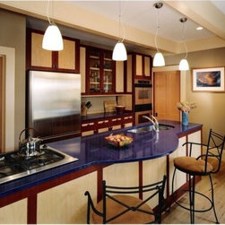 Custom built kitchen and cabinets in a fully renovated house with Corian Zodiaq countertop.