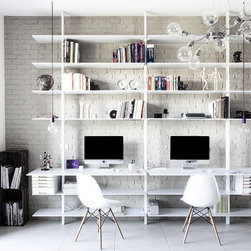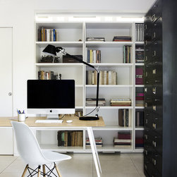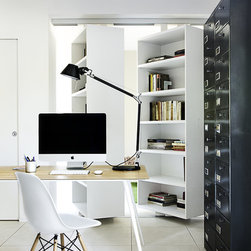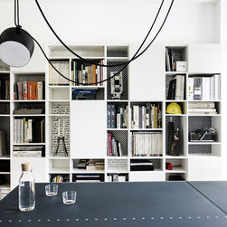 - la libreria-mobile (nel senso che si muove, ruota su se stessa), firmata Albed, è in grado di dividere la sala destinata alla presentazione dei progetti con quella operativa: basta spostare la parete di libri e il gioco (di notevole impatto) è fatto;