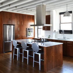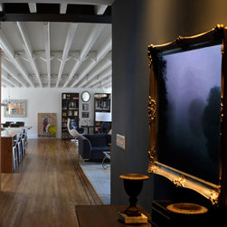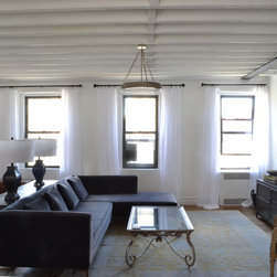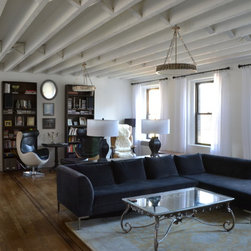Combination of two top floor apartments in a prewar tenement building. The open floor plan and design of the new space gives a spacious loft-like feel to an otherwise simple apartment. New inlay flooring and eclectic furniture plan divide the open living space into defined areas without the need for extra partitions.