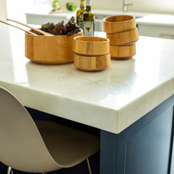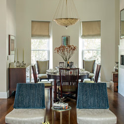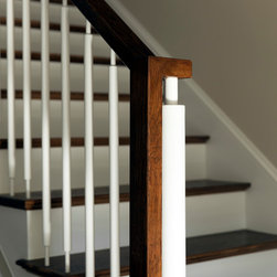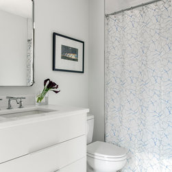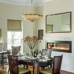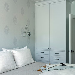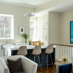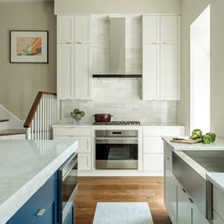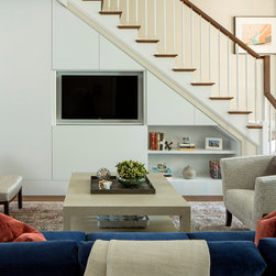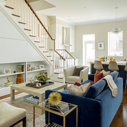 With an open plan on the first floor, LDa created areas for three defined spaces: kitchen, living and dining. Navy blue, rust, cream and white colored hues tie together each space making them feel unified in concept but separate in functionality. To add storage and architectural detail, we designed a modern-styled media wall with flat cabinetry which doubles as a bookshelf and coat closet, tucked snugly under the staircase. A new stair railing features a wood railing which speaks the mix of modern and traditional nature of the house. In the kitchen, traditional paneled cabinetry is complemented by modern appliances, lighting and hardware. Upstairs, the rooms are quieter and cozier, with a calm monochromatic palette, but still featuring unique touches such as embroidered wallpaper in the master bedroom, and custom built-ins. After infusing the classic architecture with the more stylish décor, the result is a sleek and sophisticated space that exudes warmth and light.