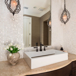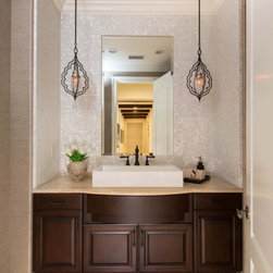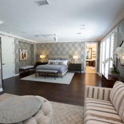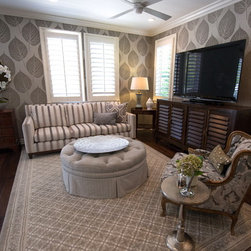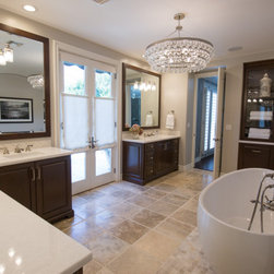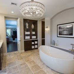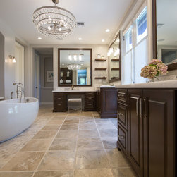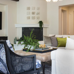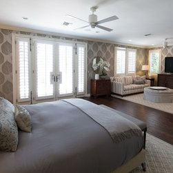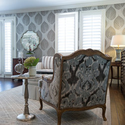 With an impressively sized canvas, this Tuscan villa's master suite was a pleasure to transform. The original builder of the home used a uniform travertine flooring throughout the house. Knowing that we wanted to maintain the flooring (everything else in the bathroom was gutted and remodeled) I was confronted with a flooring challenge when the old platform tub was removed. I could no longer find the perfect match for the large tiles but found a mosaic that complimented the existing. The large scale leaf wallpaper in the bedroom was our starting point for a grey and blue color color palette that flows flawlessly from the bathroom. The owners loved the idea of recovering some antique chairs as well as adding some new furnishings and modern accents to the sitting room.