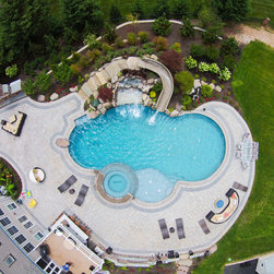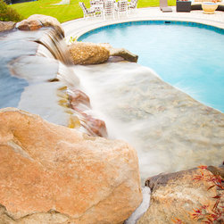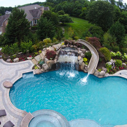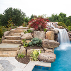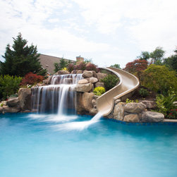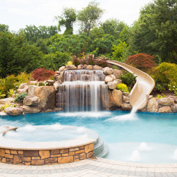 Aquatic Artists crafted this natural stone waterfall that cascades over a large pool grotto combined with an ultimate custom pool slide on a gunite pool in Bel Air, MD. The waterfall we built is 6’ high and the pool slide is manufactured by Dolphin. We also built natural stone steps that lead up...