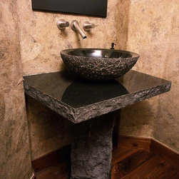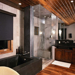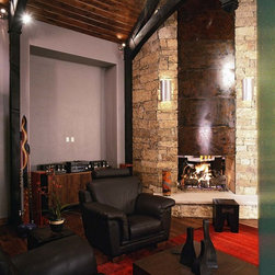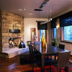 Contemporary lighting, geometric angles, the combination of natural stone and wood make the dining room a place to linger over fine cuisine!