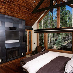 A cozy master bedroom with built-in fireplace and entertainment center that is open to nature makes the perfect sanctuary.