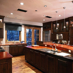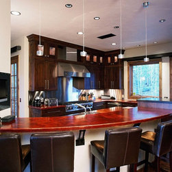 The rich color tone of the concrete counter tops makes this kitchen warm and bright. It is virtually indestructible.