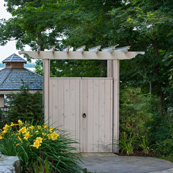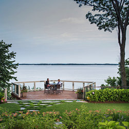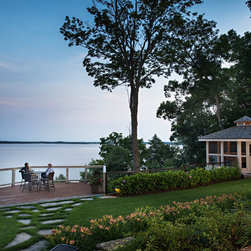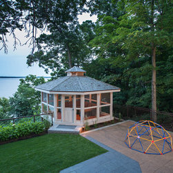 The prow deck cantilevers to overhang the first escarpment, and naturally leads your eye to nearby islands and boating traffic. Glass railings are incorporated into a wooden railing system to provide a sense of border, while minimizing the visual impact. The screened in gazebo provides three season comfort, while providing a refuge on evenings when the mosquitoes may be threatening. A children's outdoor activity terrace provides a dynamic play area, and is set on rubber tiles for cushioning.