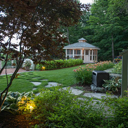 This waterfront home, set overlooking the river, provides views of both sunrise and sunsets in season. The property presented numerous very challenging constraints, including terraced grade changes, limited access, proximity to the septic field, and shallow bedrock.