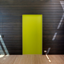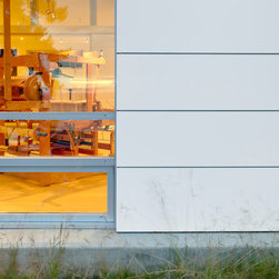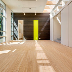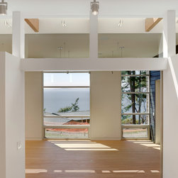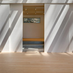 The solution is a generous main studio space flowing with natural light that provides ample space for various looms and display while maintaining incremental views of the Sound. The auxiliary spaces have been defined by the folding back of the exterior shell: to one end a bath and office, to the other the dye room. To prevent the dye fumes from permeating the rest of the studio, the dye room can be closed off from the main studio and opened to the exterior. Two additional spaces, the sewing room and a guest bedroom appear as an extrusion of the main volume, embedded into the hillside behind. A series of sliding doors act as display panels for weaving projects as well as hide or reveal access to the back rooms and storage cabinets.