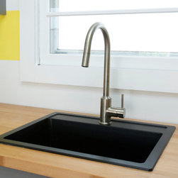 A black sink adds sharp contrast to the kitchen's yellow and grey scheme.