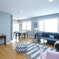 The new living and dining area is open with a grey-blue color scheme and modern touches.