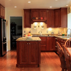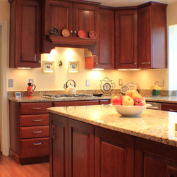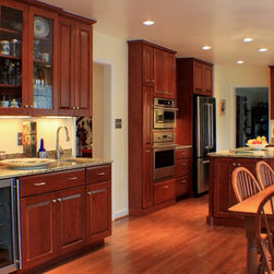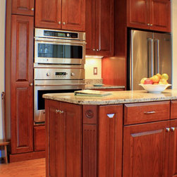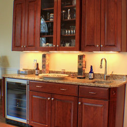 Features: Custom Wood Hood with Working Doors and Style # 9 Valance; Rosettes and Fluted Pilasters on Clipped Corners; Bar Area with Plain Glass Doors