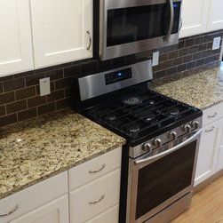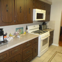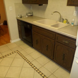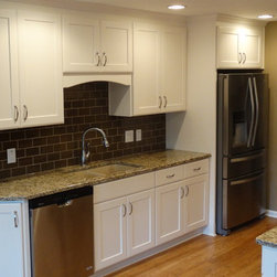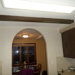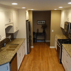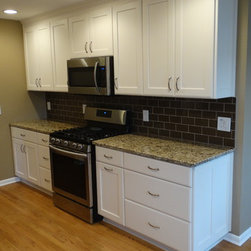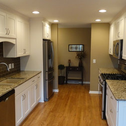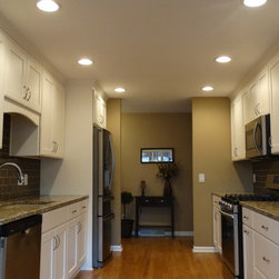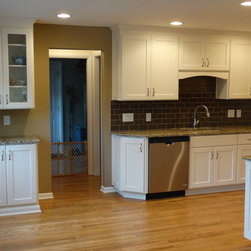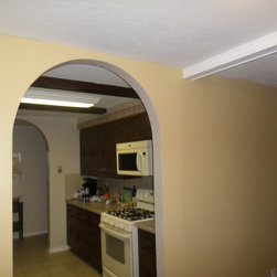 This once dark, closed in galley kitchen has become a bright and functional space. The arches at either side have been removed, along with the wall separating the kitchen and dining spaces. The outdated cabinetry has been replaced with custom white cabinets, and the old single light fixture was upgraded to recessed lighting throughout. The solid oak floors were installed unfinished and stained to match the existing floors in the rest of the home.
