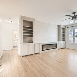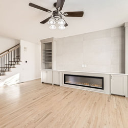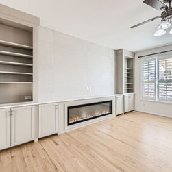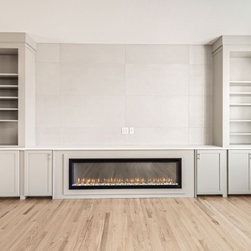 The living room centers around a sleek linear fireplace framed by custom built-ins, offering both function and style. Floor-to-ceiling tile and clean cabinetry lines create an elegant focal point, while warm hardwood floors bring natural balance and warmth to the space.