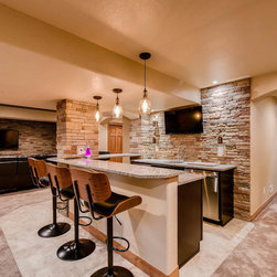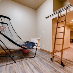 This modern rustic design include rock wall accents, a full wet bar, built-in hoop and loft.
