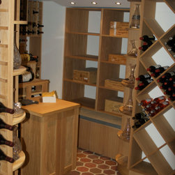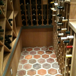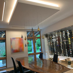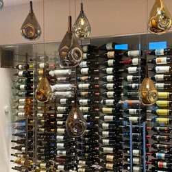 A wine wall constructed in the wall of an existing dining room with Bomma Soap mini pendants