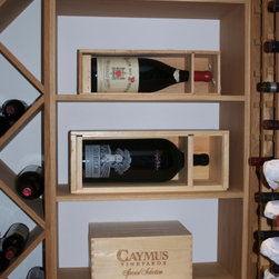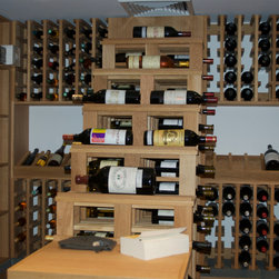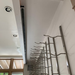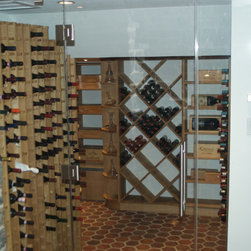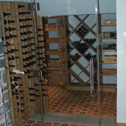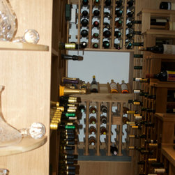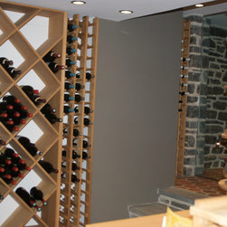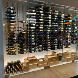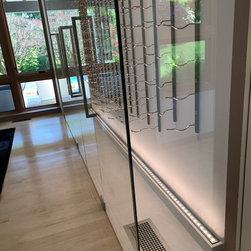 A wine wall constructed in the wall of an existing dining room with ambient lighting