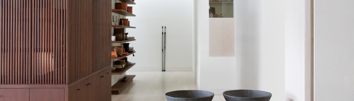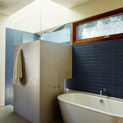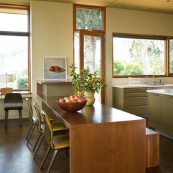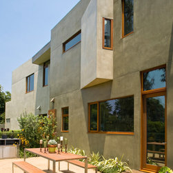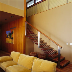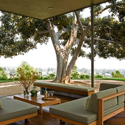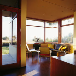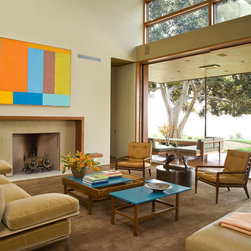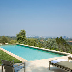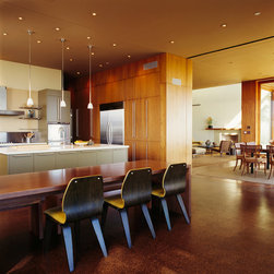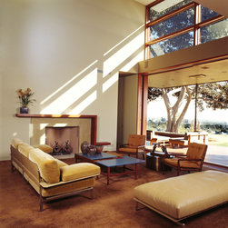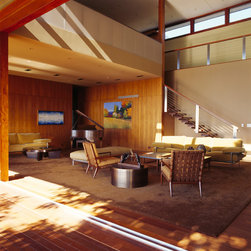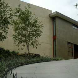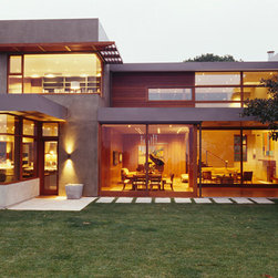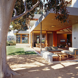 The Winebaum Residence is a two-story single-family home sited on a canyon promontory with a 270 view from the Getty Center to the Santa Monica Bay. The approach, up the oak lined drive to the simple solid entry, belies the views that unfold upon entering the house. A large light-filled double-height living room space occupies the center of the house. Each of the major downstairs spaces opens onto a garden or patio each with a different character or view. While the plan is very modern the material characteristics are warm and inviting. The house was designed with a solar panel system on the roof and environmentally safe materials were chosen wherever possible.