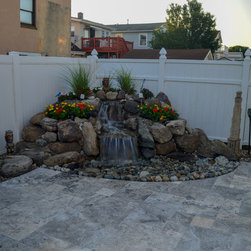 Aquatic Artists crafted this natural pondless waterfall in Brigantine, NJ at the Jersey Shore. The waterfall is 3’ high and we placed planting beds throughout this water feature to enhance the natural look.