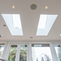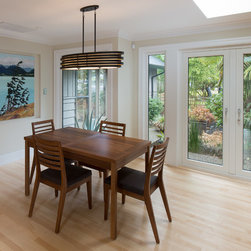 Large windows and skylights bring in more light and french doors carry forth that openness to the backyard.