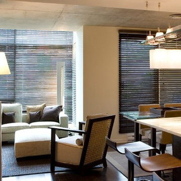 Boasting views of the Museum of Natural History and Central Park, the Beaux Arts and French Renaissance style building built in 1900 was once home to a luxury hotel. Over the years multiple hotel rooms were combined into the larger apartment residences that exist today. The resulting units, while large in size, lacked the continuity of a single formed space. StudioLAB was presented with the challenge of re-designing the space to fit a modern family’s lifestyle today with the flexibility to adjust as they evolve into their tomorrow. Thus, the existing configuration was completely abandoned with new programmatic elements being relocated in each and every corner of the space. For clients that are big wine connoisseurs, the focal point of entry and circulation lies in a 400 bottle, custom built, blackened steel and glass, temperature controlled wine cabinet. The once enclosed living room was demolished to create one main entertaining space that includes a new dining area and open kitchen. Hafele bi-folding pocket door slides were used in the Living room wall unit to conceal the television, bar and display shelves when not in use. Posing as kitchen cabinetry, a hidden integrated door opens to reveal a guest bedroom with an en suite bathroom. Down the hallway of wide plank ebony stained walnut flooring, a compact powder room was built to house an original Paul Villinski installation of small butterflies cut from recycled aluminum cans, entitled Mistral. Continuing down the hall, and through one of the walnut veneered doors, is the shared kids bedroom where a custom-built bunk bed with integrated storage steps and desk was designed to allow for play space and a reading corner. The kids bathroom across the hall is decorated with custom Lego inspired hand cast concrete tiles and integrated pull-out footstools residing underneath the floating vanity. The master suite features a bio-ethanol fireplace wrapped in blackened steel and integrated into the Tabu veneered built-in. The spacious walk-in closet serves several purposes, which include housing the apartment’s new central HVAC system as well as a sleeping spot for the family’s dog. An integrated URC control system paired with Lutron Radio RA lighting keypads were installed to control the AV, HVAC, lighting and solar shades all by the use of smartphones.