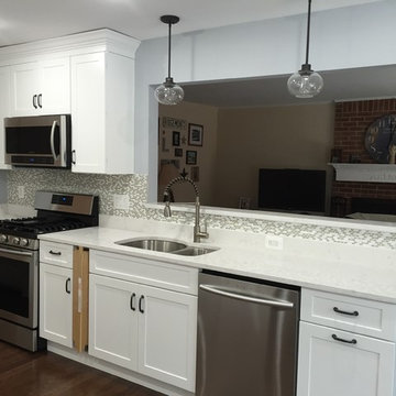 Powder room - transitional multicolored floor and wainscoting powder room idea in St Louis with white walls and an undermount sink