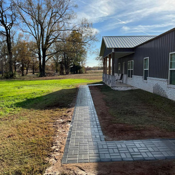 View of back of home - shipping container addition on a straw bale home. Very creative & compact design with tons of character and eclectic recycled materials.