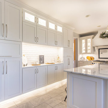 Inspiration for a cottage l-shaped dark wood floor kitchen remodel in New York with shaker cabinets, white cabinets, white backsplash and an island