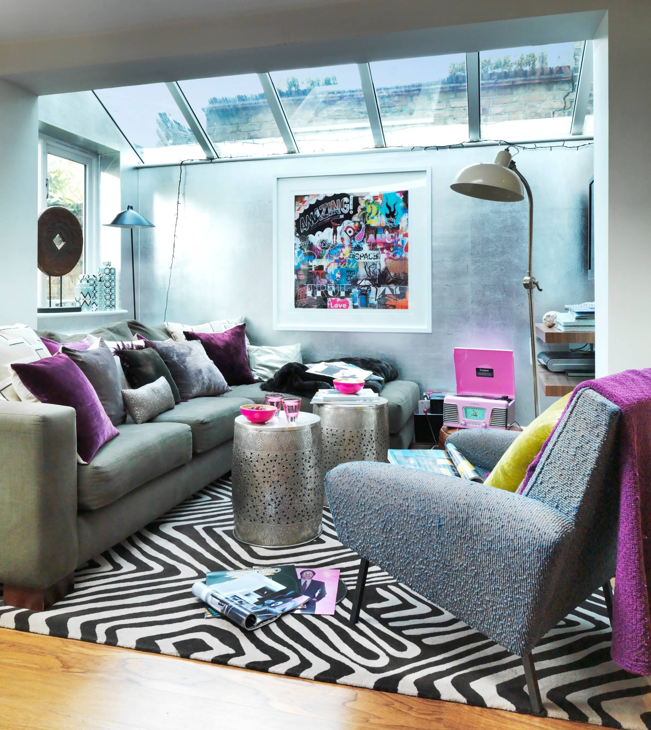 ものはたくさんあるものの、ギュッとコンパクトにまとまり、心地良さが感じらるエクレティックなリビングスペース。色も豊富に使われていますが、大きなラグが全体をまとめてくれています。