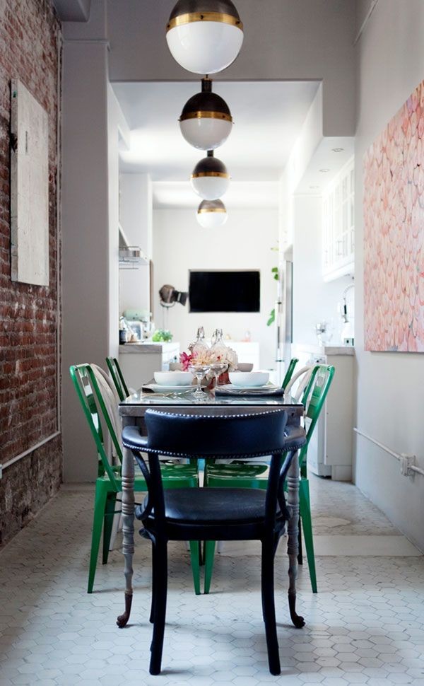 まるで廊下のような細長いダイニング。細長のテーブルを使っていることでバランスが取れ、動線も確保できています。ミスマッチした椅子がカジュアルな雰囲気をつくり出し、さらにグリーンのチェアが印象的なポイントにもなっています。第一印象を「狭い」から「特徴的」に変えてくれる、個性あるしつらえを考えるのが大切だと思わせてくれる空間です。