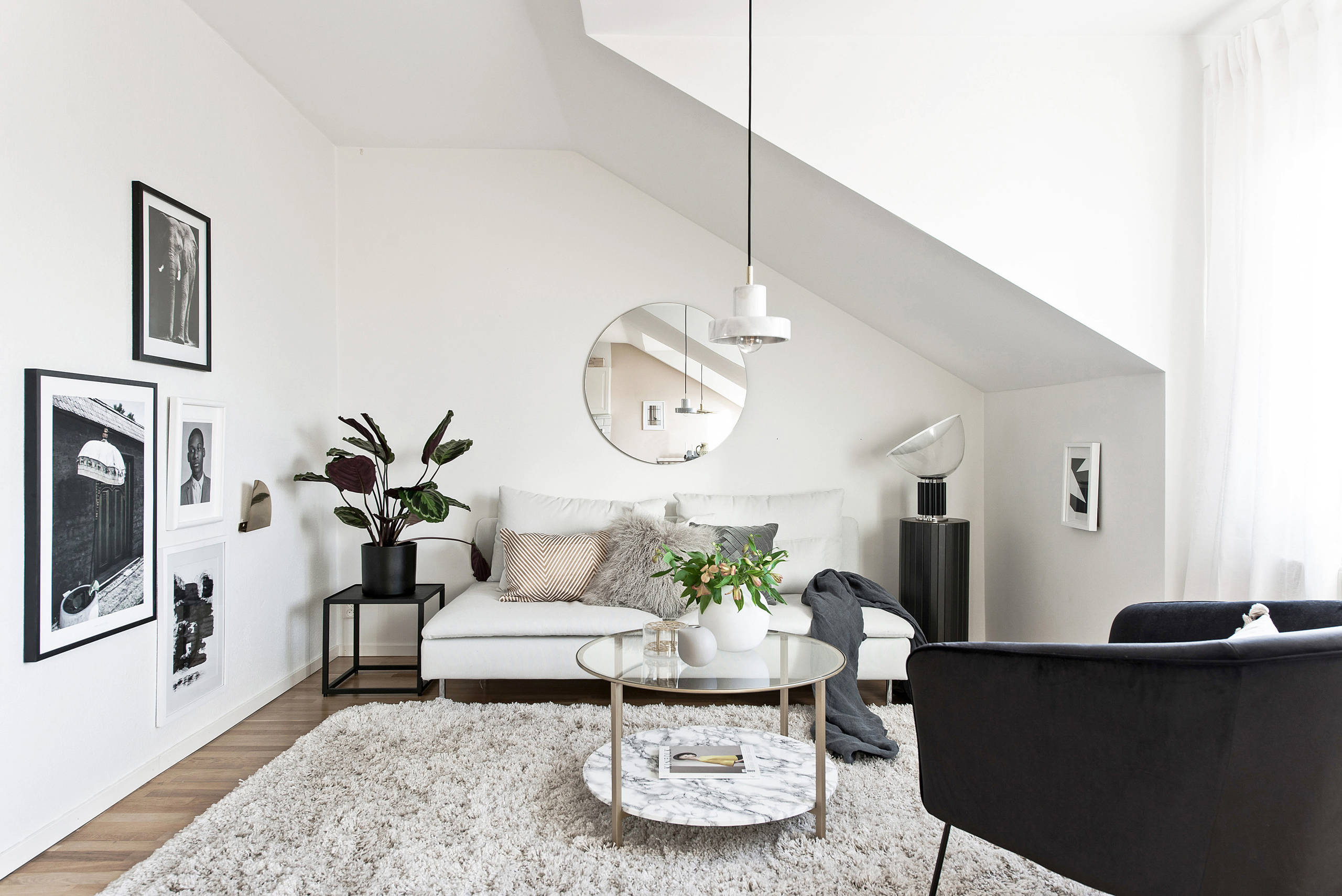 せっかく置くならアート感覚に、素敵な鏡を選びたいですね。丸い窓のようなこちらの鏡、反対側のピンクの壁が映り込んでいてモノトーンの部屋にほんのりと温かみを与えてくれています。