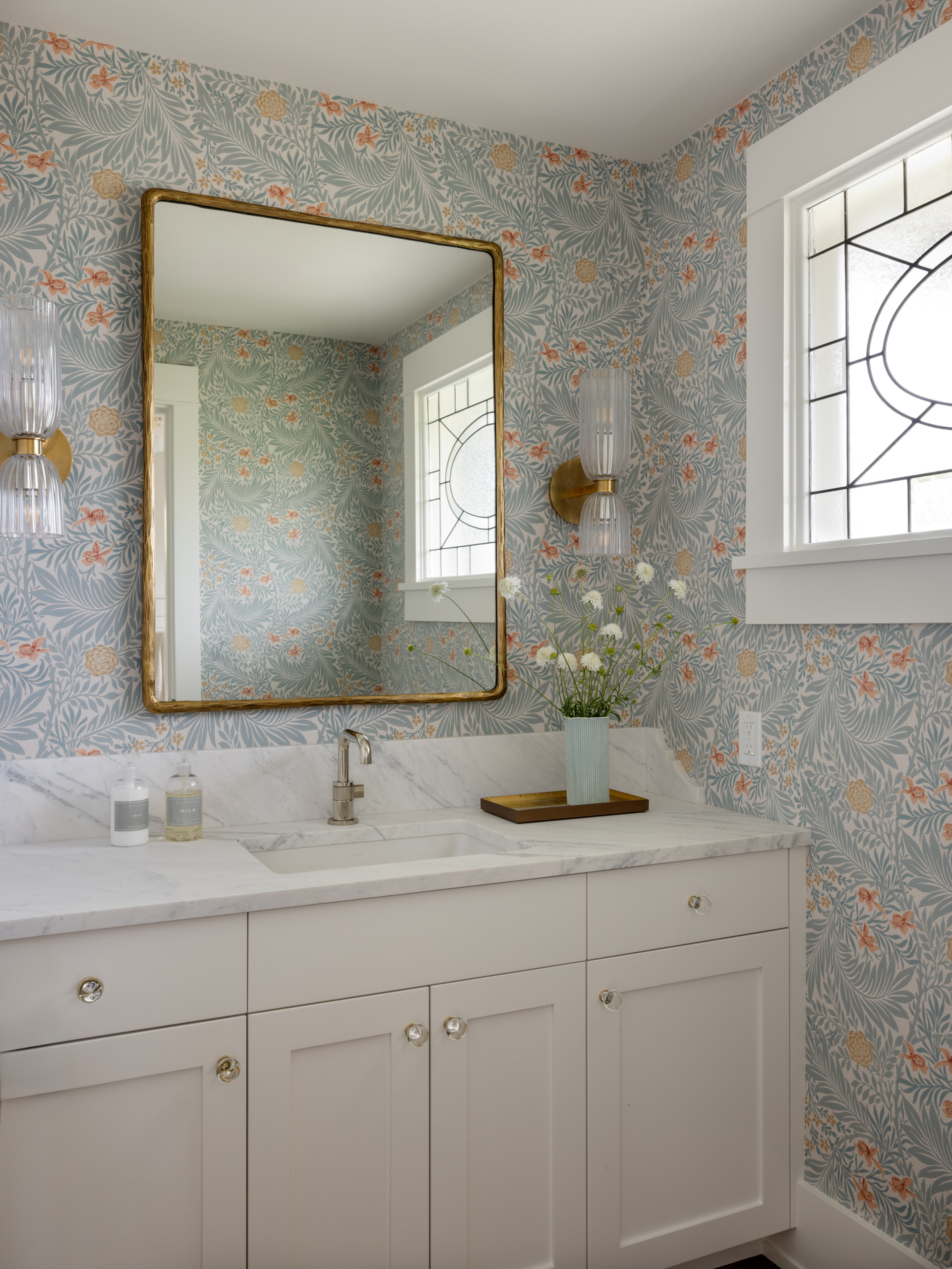 Designer Tammara Stroud, discovered by the homeowner on Houzz, brought vintage flair to this 1904 Seattle bungalow powder room with a William Morris botanical wallpaper. Paired with glass-and-brass sconces, crystal hardware and a hammered brass mirror frame, the wallpaper amplifies the Craftsman-style charm while adding sophisticated, timeless style to the small space.