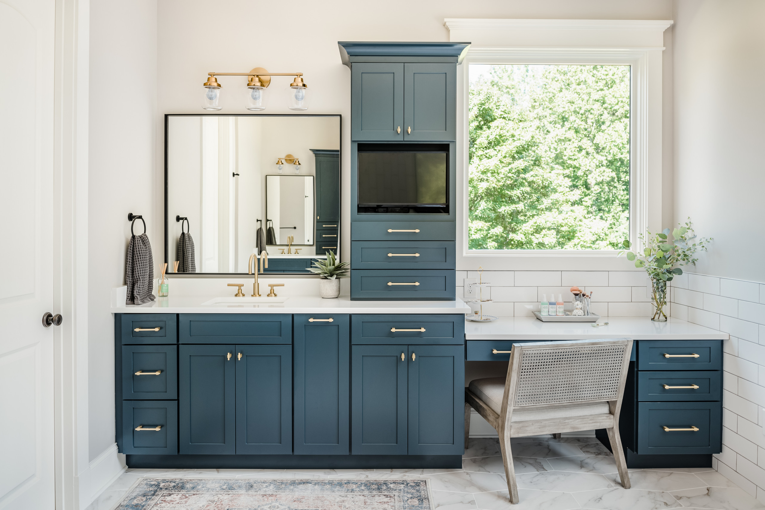 For this Mooresville, North Carolina, bathroom, designer Laura Anderson of Craft and Trade Renovations blended white, navy and brass for a chic, functional look. One of the custom navy vanities features a built-in seated section with drawers for makeup and skincare essentials. Pullouts include electrical outlets for a hair dryer and curling iron, while a nearby tower offers drawers for stackable jewelry trays, an upper cabinet for travel toiletries and even a flat-screen TV.