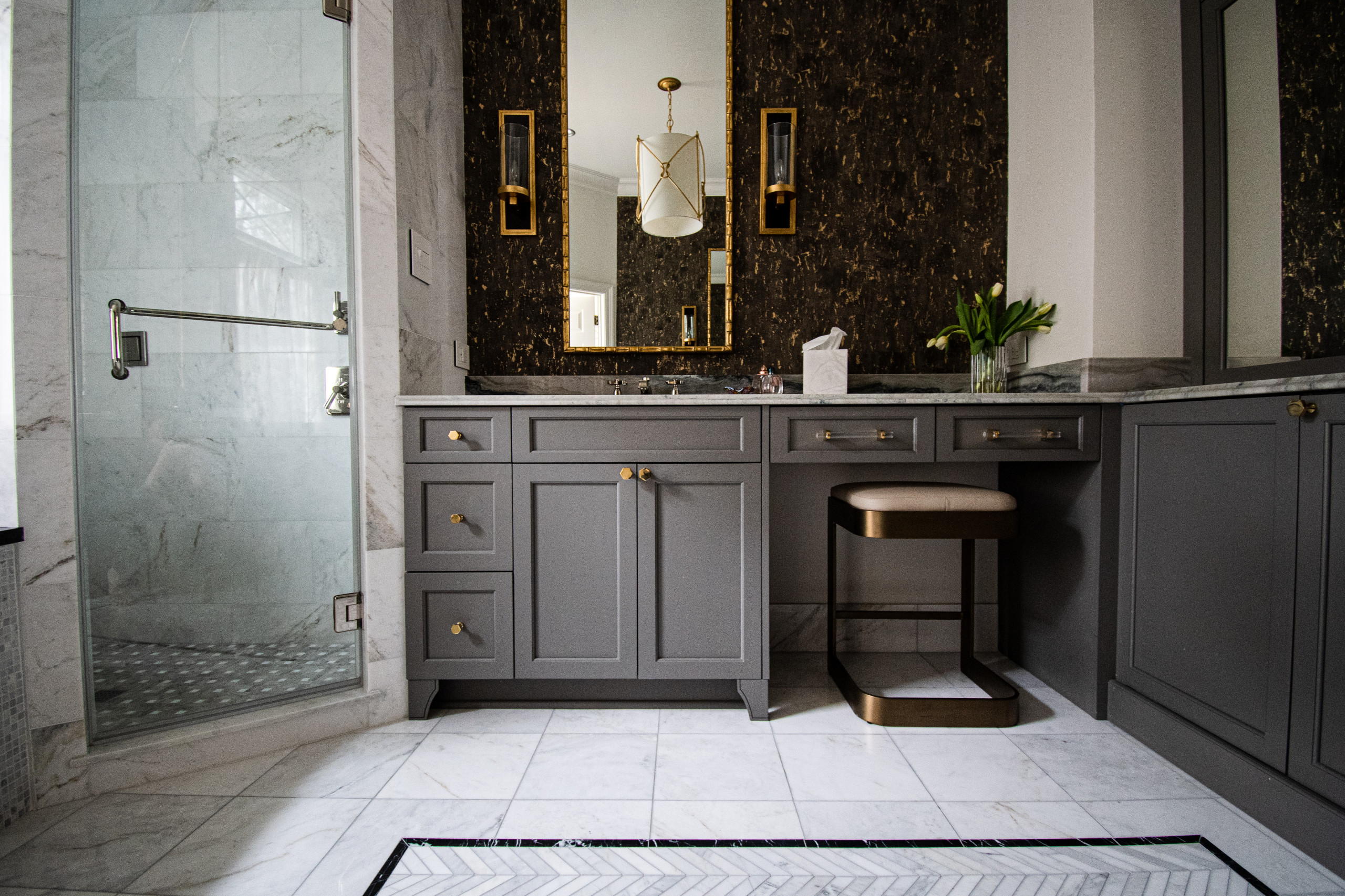 In this updated Pacific Palisades, California, bathroom, designer Amy Rothman of Architrave Interiors created an expansive vanity in a warm medium-dark gray (Peppercorn by Sherwin-Williams) with a built-in makeup area. The seated space includes a mirrored medicine cabinet with a spring-loaded door that echoes the black-framed mirrors above the main vanity.