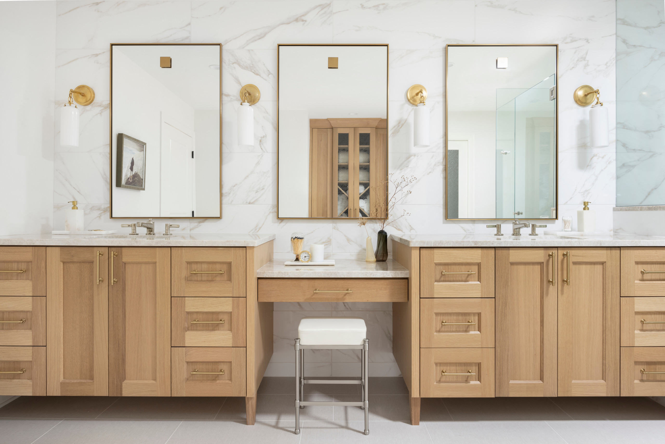 This updated Lake Oswego, Oregon, bathroom, designed by Amy Pearson and built by contractor Dick Baty, features two rift-cut white oak vanities with a custom stain and a central lower makeup counter. The makeup area includes a dedicated drawer for storage and a sleek stool. Three mirrors and four sconces with milk glass shades create a sense of symmetry, enhancing the calm, soothing atmosphere.