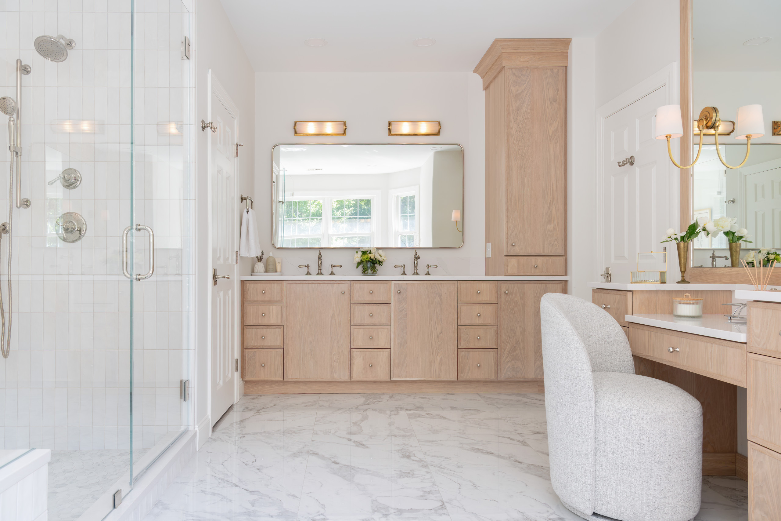 Whitney Nelson of Granite State Cabinetry designed a makeup table vanity for her Concord, New Hampshire, clients while updating the primary bathroom in their traditional New England Colonial. Removing an unused fireplace bump-out and tub deck created space for a plain-sawn, whitewashed oak vanity with a marble-look quartz countertop, seating and storage. A custom mirror with a matching oak frame hangs above. Sconces mounted to the mirror add soft, graceful curves, giving the classic space a subtle modern edge.