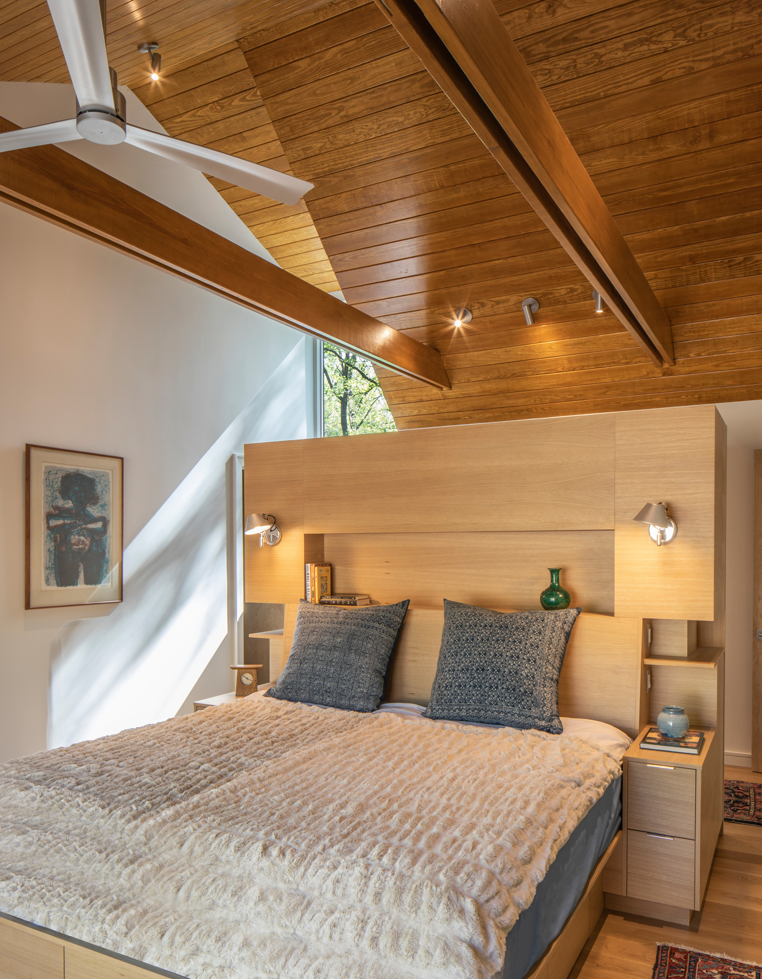 This Denver bedroom by Kimball Modern Design + Interiors features a wood-paneled ceiling that adds warmth and visual texture.