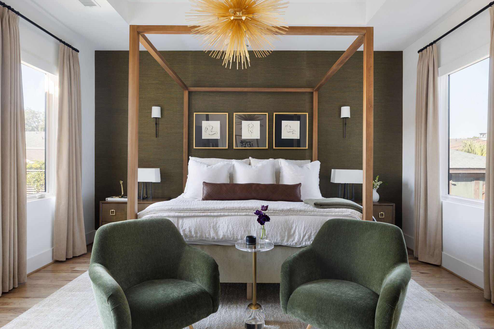 This Houston bedroom by L Design Group features a richly colored grasscloth wallpaper on the headboard wall that adds depth to the room while allowing the statement canopy bed to stand out.